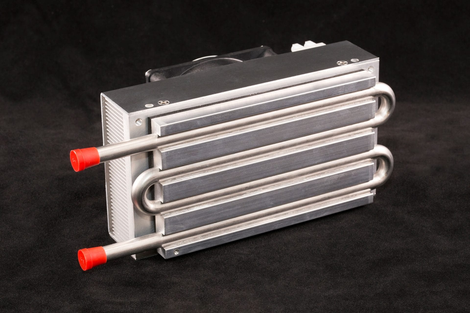 Features: A four-pass stainless steel liquid loop provides a very good thermal link between the fluid and the four thermoelectric modules. Can be used for heating and cooling. Optional mixer coils can be added to improve performance at low flow rates or with viscous fluids. This cooler is powered by 24 VDC and is compatible with all of our temperature controllers. The fan is speed is also controllable when used with the TC-720 series controllers.