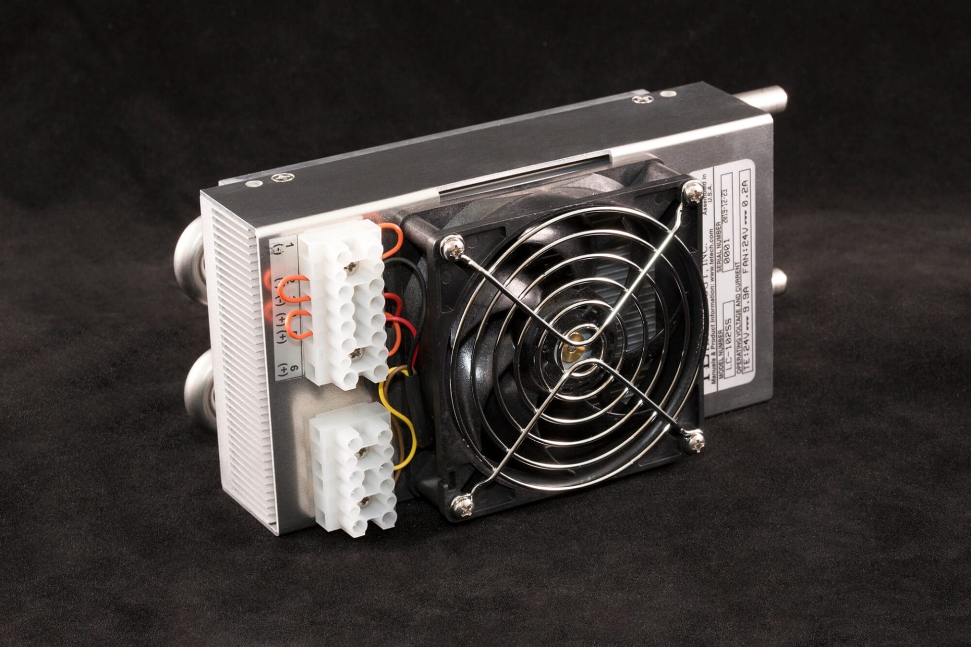 Features: A four-pass stainless steel liquid heat exchanger loop provides a very good thermal link between the fluid and four thermoelectric modules. Can be used for heating and cooling. Optional mixer coils can be added to improve performance at low flow rates or with viscous fluids. This cooler is powered by 24 VDC and is compatible with all of our temperature controllers. The fan speed is also controllable when used with TE Technology’s TC-720 series temperature controllers. Labeled wiring cables are included free of charge when purchasing interconnected standard products on the same order (thermoelectric cooling assembly or module, temperature controller and/or a power supply). The number of cables included (1-3 pairs) will depend on the number of components being interconnected.