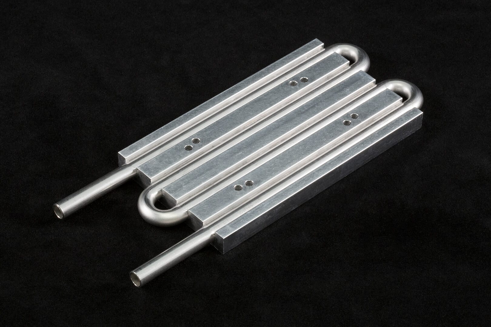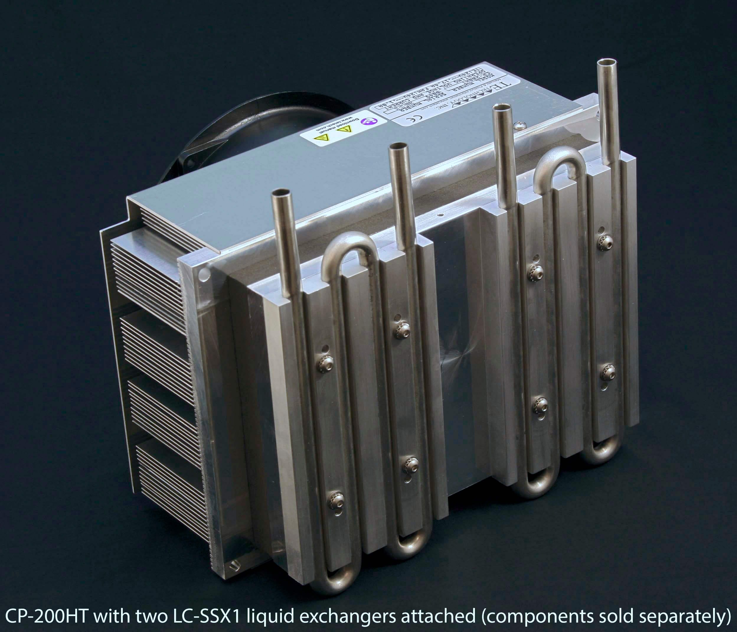 Two LC-SSX1 liquid exchangers shown mounted to a CP-200 cold plate cooler. The cold plate coolers are sold separately and the LC-SSX1 exchangers are sold individually. The LC-SSX1 exchanger can be mounted to other cold plate coolers–see specification sheet for details.