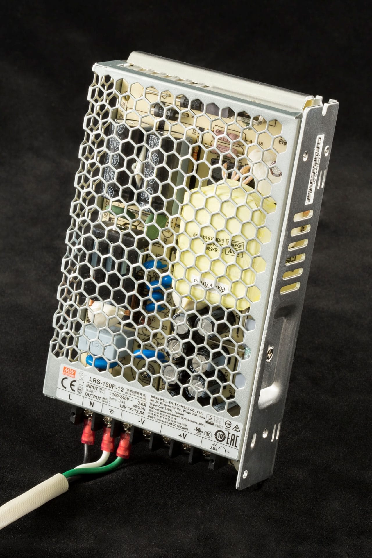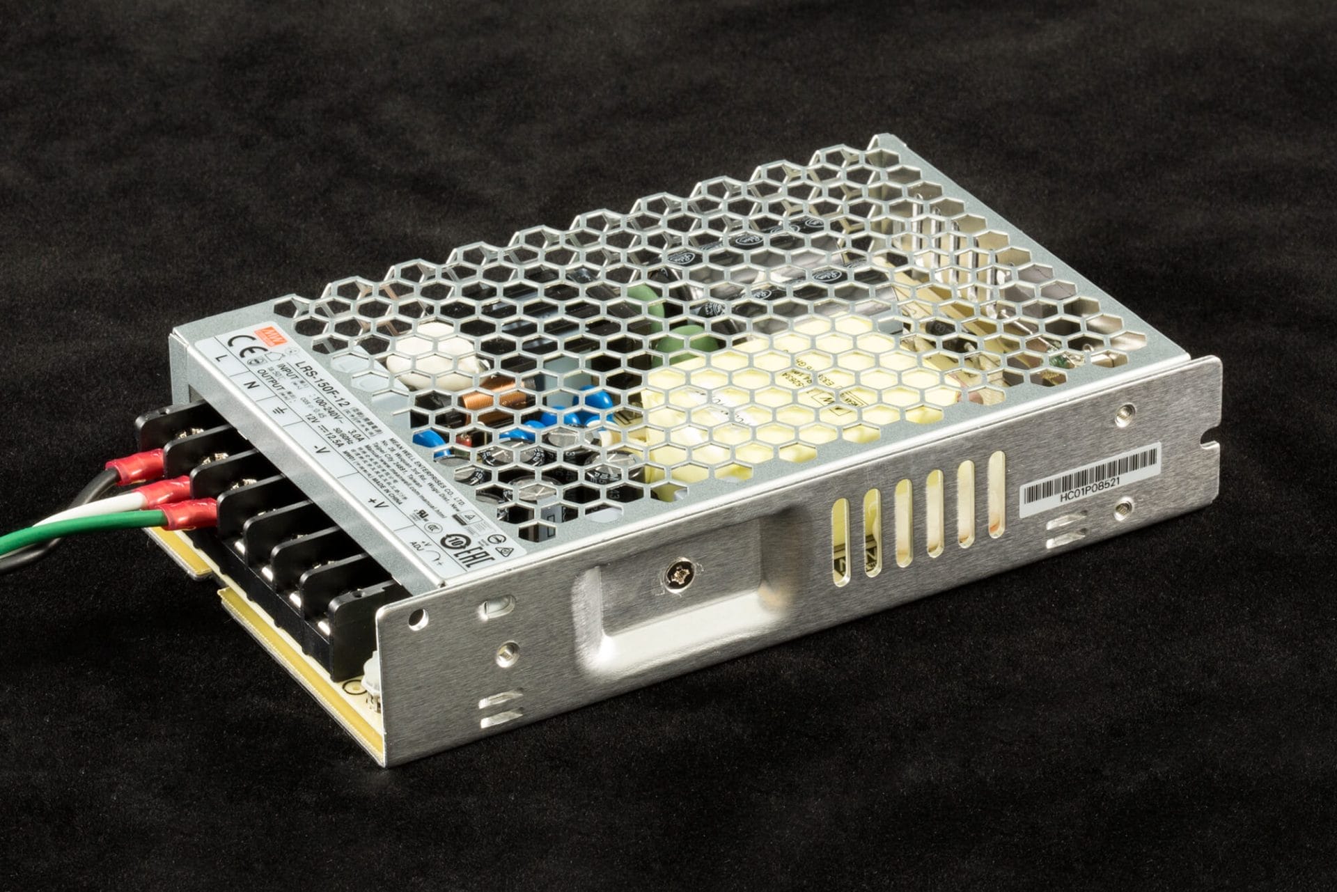 A 12 volt DC, fixed-voltage power supply capable of delivering up to 12.5 amps of current. The input voltage is auto-ranging. One North-American standard power cord is supplied attached to the power supply, and power cords for the UK, EU, and Italy can be purchased separately.