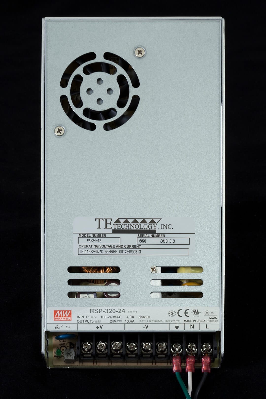 A 24 volt DC, fixed-voltage power supply capable of delivering up to 13 amps of current. One North-American standard power cord is supplied attached to the power supply, and power cords for the UK, EU, and Italy can be purchased separately. The power supply features a wide input voltage range; no manual selection necessary. Labeled wiring cables are included free of charge when purchasing interconnected standard products on the same order (thermoelectric cooling assembly or module, temperature controller and/or a power supply). The number of cables included (1-3 pairs) will depend on the number of components being interconnected.