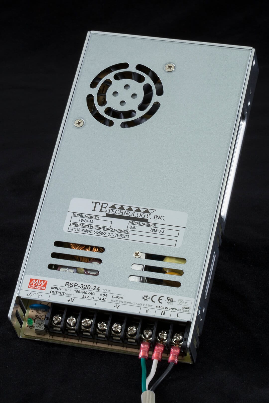 A 24 volt DC, fixed-voltage power supply capable of delivering up to 13 amps of current. Power supply is pictured with the included power cord attached. The power supply features a wide input voltage range; no manual selection necessary. One North-American standard power cord is supplied attached to the power supply, and power cords for the UK, EU, and Italy can be purchased separately.